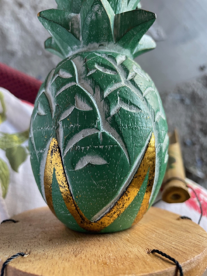Green Wood Pineapple with gold Trim and Bamboo wind chimes.